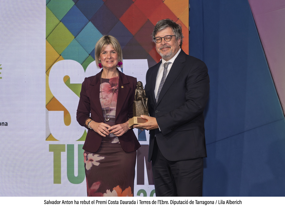 La presidenta de la Diputació ha lliurat a Salvador Anton el Premi Costa Daurada i Terres de l’Ebre per la seva trajectòria professional i la seva contribució en el món del turisme i, concretament, pel desenvolupament de les dues destinacions. Amb aquest guardó, el Patronat de Turisme de la Diputació de Tarragona vol expressar l’agraïment col·lectiu del territori a aquells agents que, amb el seu esforç, compromís i dedicació, han contribuït de manera tangible a la consolidació de la Costa Daurada i les Terres de l’Ebre com a destinacions turístiques.
